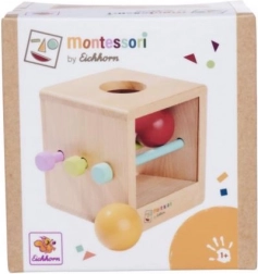 De Montessori box is gebaseerd op de principes van de Montessori-pedagogiek: het kind laat een bal door de opening vallen, observeert de beweging en leert zich te concentreren en geduldig te zijn. Ingevoegde staafjes blokkeren tijdelijk de doorgang, zodat kleine ontdekkers kunnen uitproberen wat er gebeurt wanneer ze worden verwijderd. Zonder staafjes is de activiteit eenvoudiger en ideaal voor jongere kinderen.
