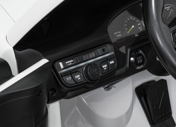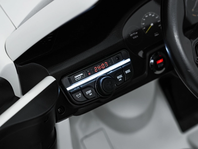 Ouders zullen de 2,4 GHz afstandsbediening met drie snelheden en een noodstopknop waarderen. Kinderen genieten van het multimediapaneel met FM-radio, MP3, USB en Bluetooth en de “SPORT”-modus met realistische geluiden bij het gasgeven. EVA-schuimbanden maken geen lawaai en de schokdempers voor en achter verwerken oneffenheden moeiteloos.
