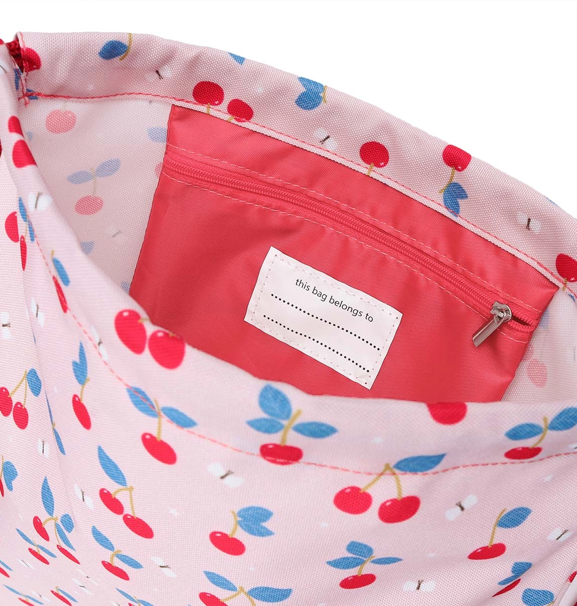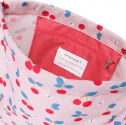 - Design: kersenmotief; te combineren met rugzak, toilettasje, fles en broodtrommel in dezelfde stijl
