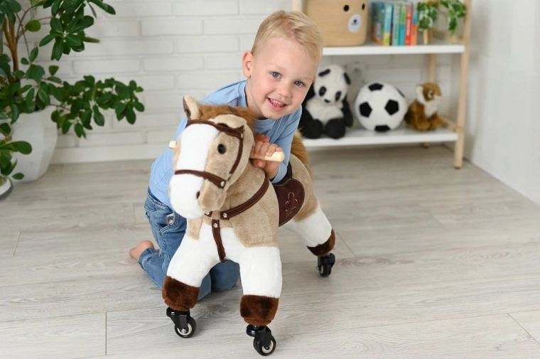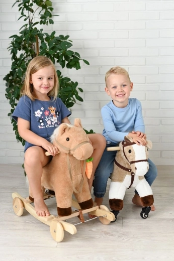 Stijlvolle rijvriend voor kleine paardenliefhebbers. Een stevige constructie, zachte pluche en vlotte wieltjes nodigen uit tot ritjes door huis en gang.
