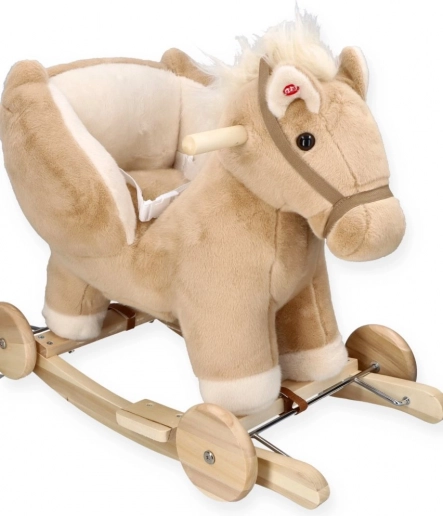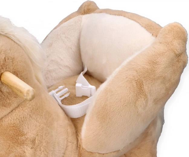 Beige schommelpaard Pegas met zitje en wieltjes. Zithoogte 31–35 cm, voeding 2× AA, batterijvak onder het buikje, CE-certificering.