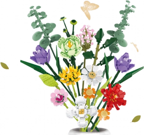 De bouwset is ideaal voor decoratie, spel en educatie. Realistisch uitgewerkte bloemen in tinten wit, rood, groen, roze, paars en geel verfraaien elk interieur en zijn ook perfect als origineel cadeau.