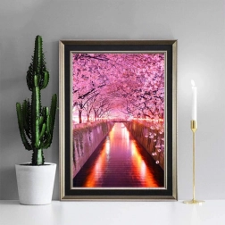 Deze creatieve diamantschilder-set leidt je stap voor stap naar een indrukwekkend schilderij met een motief van kersenbloesems boven een waterweg. Het hoogwaardige zelfklevende canvas met gekleurde symbolen zorgt voor eenvoudig plaatsen van de steentjes en een soepel creatief proces. Het voltooide schilderij valt op door een subtiele glans die je huis een unieke flair geeft.