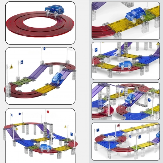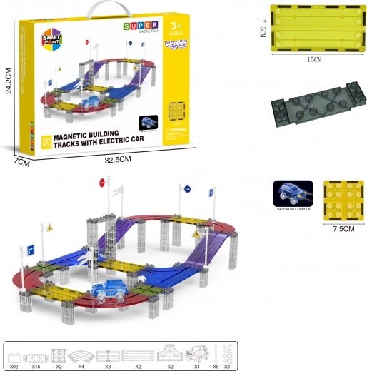 Ontdek de creatieve wereld van de WOOPIE bouwracebaan, die fantasie, creativiteit en logisch denken stimuleert. Magnetische onderdelen klikken snel en stevig aan elkaar, zodat kinderen vanaf 3 jaar zonder gereedschap kunnen monteren. Gekleurde transparante elementen in combinatie met het LED-autootje creëren een boeiende lichtshow.