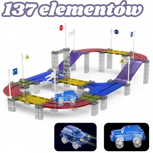 De magnetische racebaan van WOOPIE verandert spelen in een geweldig avontuur vol licht en kleur. Dankzij de eenvoudig te koppelen magnetische onderdelen bouwen kinderen zelfstandig verschillende meerlaagse banen, waarover een lichtgevend LED-autootje rijdt. Transparante, kleurrijke elementen zorgen voor veel plezier overdag en ’s avonds.