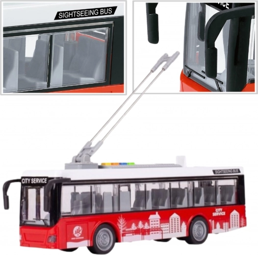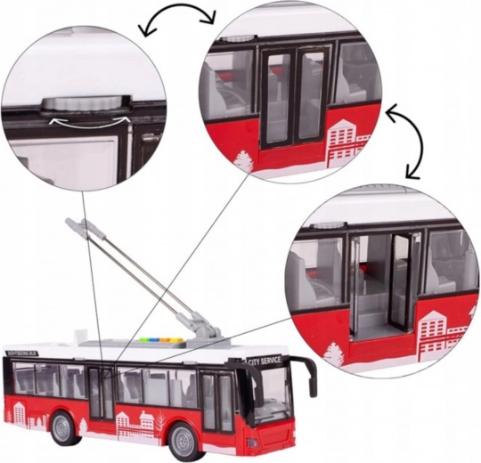 Het realistische model van een stadstrolleybus van het merk WOOPIE zal alle kleine vervoersfans verrassen. Het biedt licht- en geluidseffecten, openende deuren, bewegende pantografen en frictie-aandrijving voor rijden vooruit en achteruit. Een geweldige keuze voor creatief spel en leren over het openbaar vervoer.