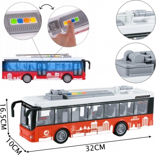 Deze gedetailleerde trolleybus op schaal 1:16 biedt kinderen een authentieke ervaring van stadsvervoer. Dankzij vier knoppen op het dak genieten ze van realistische rijgeluiden, signalen en omroepberichten, terwijl de interne verlichting de sfeer van een echt voertuig benadrukt. De frictie-aandrijving zorgt ervoor dat hij na een lichte duw enkele meters rechtuit rijdt.