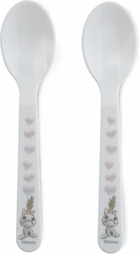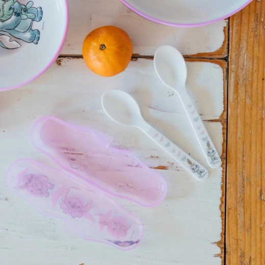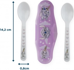 Praktische set van twee kinderschepjes met etui met het motief van Lilo en Stitch, ideaal voor onderweg en voor de opvang. De ergonomische vorm past perfect in kleine handjes, het reisetui houdt de lepeltjes schoon en hygiënisch en het materiaal is BPA-vrij. Voldoet aan norm EN 14372.