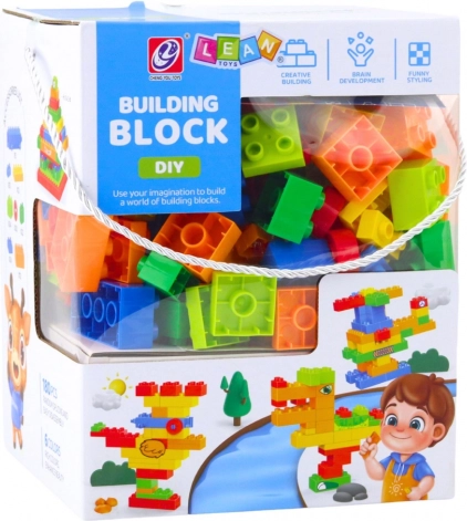 Kleurige bouwset met 180 onderdelen van veilige kunststof. Grote stukken, afgeronde randen, praktische verpakking met handgreep. Stimuleert creativiteit en fijne motoriek.