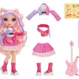 De Rainbow High Junior Bella brengt een iconische roze look en een muzikale twist. Dankzij de gewrichten zet je haar gemakkelijk in epische podiumposes én in alledaagse scènes. Bella is klaar om te schitteren met haar basgitaar en accessoires die haar unieke stijl onderstrepen.