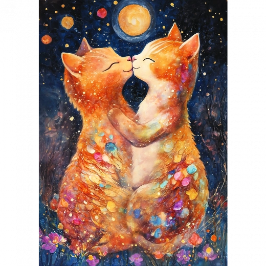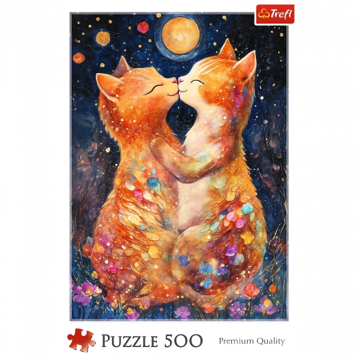 Romantische puzzel met een motief van twee kittens bij een kus in het maanlicht, met 500 stukjes en een eindformaat van 48 × 34 cm. Gemaakt in Polen van hoogwaardige materialen met aandacht voor het milieu en met speciaal gekalanderd papier voor minder schittering en comfortabeler puzzelen.