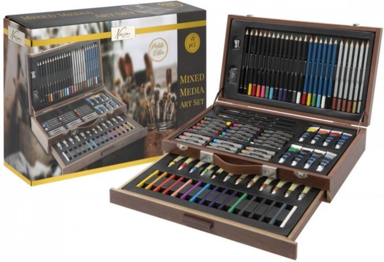 De inhoud van de set is samengesteld om het volledige spectrum aan artistieke behoeften te dekken – van tekening tot acryl en aquarel. Je probeert eenvoudig droge en natte technieken uit, laagjes combineren en tinten mengen. Dankzij de praktische verpakking is de set geschikt voor thuis, op school en onderweg.
