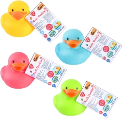 Vrolijke rubberen badeendjes voor in bad brengen plezier in bad, zwembad en op vakantie aan zee. Dankzij het zachte, gemakkelijk in te drukken materiaal liggen ze prettig in de hand, zelfs voor de allerkleinsten, en stimuleren ze de zintuigen en de fijne motoriek. Het compacte formaat van 8 × 8 cm en de heldere kleuren spreken elk kind aan.