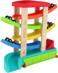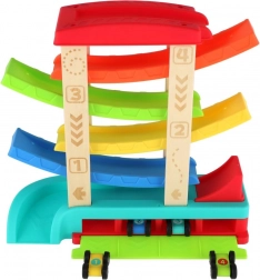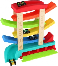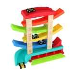 Deze cascade-racebaan combineert stevige houten kolommen en duurzame kunststof hellingen in heldere kleuren die de nieuwsgierigheid en het visuele waarnemen van kinderen prikkelen. Kinderen ontwikkelen hun fijne motoriek, oog-handcoördinatie en begrip van oorzaak en gevolg terwijl ze de rit van de autootjes volgen.