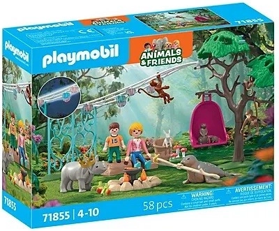 Het kleine neushoorntje is jarig en iedereen is uitgenodigd! De zeehond bereidt heerlijke geroosterde appels boven het vuur, het konijntje neemt een pauze na vrolijke spelletjes en de gasten verzamelen zich onder de slinger die in het donker licht. De PLAYMOBIL-set biedt tal van mogelijkheden voor creatief spel, zowel overdag als ’s nachts.