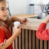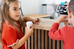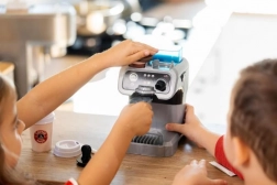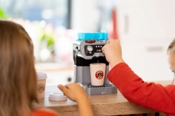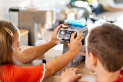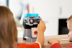 Het waterreservoir en de doorstroomfunctie laten kinderen “koffie” in het bekertje bereiden met één druk op de knop – net als in een echte koffiebar.