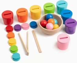 Deze interactieve Montessori-speelset brengt leren op een speelse manier voor kinderen vanaf 3 jaar. Kinderen sorteren knikkers en houten muntjes in bekertjes op kleur, proberen te verplaatsen met een lepeltje, pincet en Chinese stokjes en oefenen geduld, precisie en concentratie. Dankzij de vrolijke kleuren en verschillende hulpmiddelen ontwikkelen ze tastgevoeligheid en visuele waarneming.