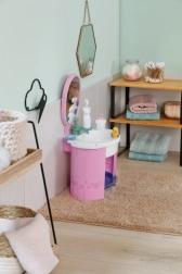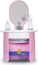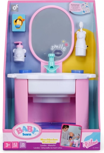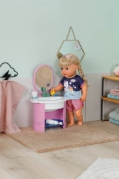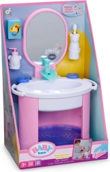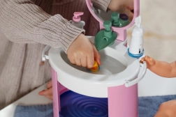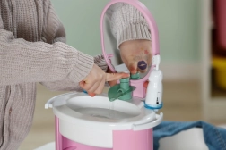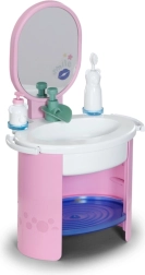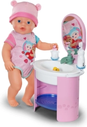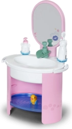 De Baby Born wastafel biedt kinderen authentiek badkamer‑speelplezier zonder batterijen. Door handmatig pompen stroomt echt water in de wastafel, dat wordt tegengehouden door de vrolijke stop Berta in de vorm van een eendje. Zo kunnen kinderen op een leuke en veilige manier de hygiëneroutines van hun pop oefenen.