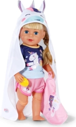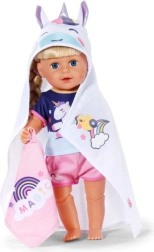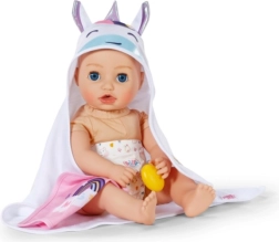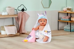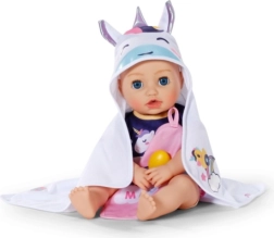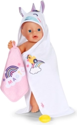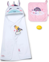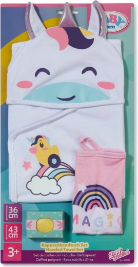 Verwen je pop na het bad met maximaal comfort met deze schattige BABY born handdoekenset. Bevat twee heerlijk zachte stuks met een eenhoorn- en regenboogmotief, een kap met print en oortjes. Ideaal voor poppen van 36 cm en 43 cm. Zacht materiaal, magisch eenhoornmotief en praktische capuchon voor stijlvol drogen en spelen.