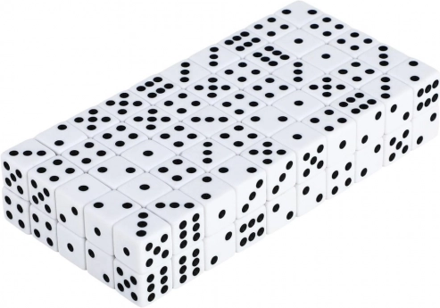 Praktische set van 100 witte dobbelstenen met klassieke aanduiding 1–6, ideaal voor scholen, clubs en thuisgebruik. Dobbelstenen van duurzame kunststof met zwarte, goed leesbare stippen en een prettig glad oppervlak zorgen voor een lange levensduur en speelcomfort.