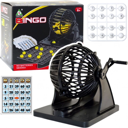 - Lotmachine, 80 balletjes, 20 kaarten, bord voor getrokken nummers, instructies