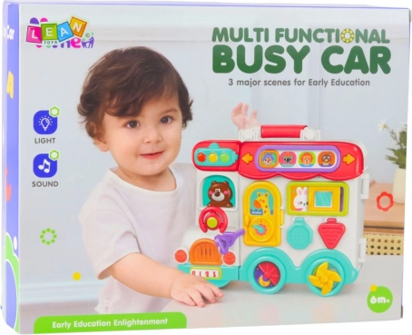 De interactieve auto “Busy Car” combineert een educatief paneel, een vormensorteerder, een klein pianootje en beweegbare elementen die kinderen stimuleren om de wereld van kleuren, vormen, licht en geluid te ontdekken. Kinderen kunnen op verlichte knoppen drukken, deurtjes openen, wieltjes draaien, elementen schuiven en zo oog-handcoördinatie, fijne motoriek en verbeelding ontwikkelen.