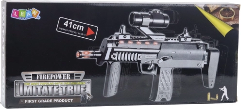 Speelgoedmachinegeweer 41 cm in zwart met licht- en geluidseffecten en vizier. Duurzame kunststof, cadeauverpakking. Geweldig cadeau voor actiespellen.