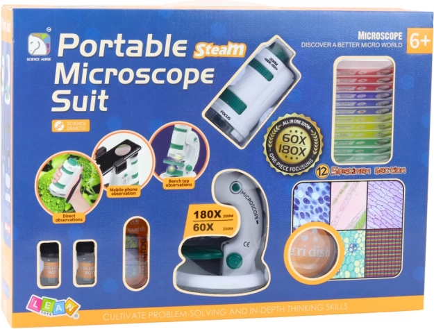 Ontdek de microwereld op een speelse manier met deze compacte 2-in-1 kindermicroscoop. Biedt 60x en 180x vergroting, LED-verlichting in de microscoop én in de standaard en soepele scherpstelling. De uitgebreide accessoires, inclusief een telefoonhouder, kant-en-klare preparaten en lege objectglaasjes, maken deze set tot een ideaal cadeau voor jonge ontdekkers.