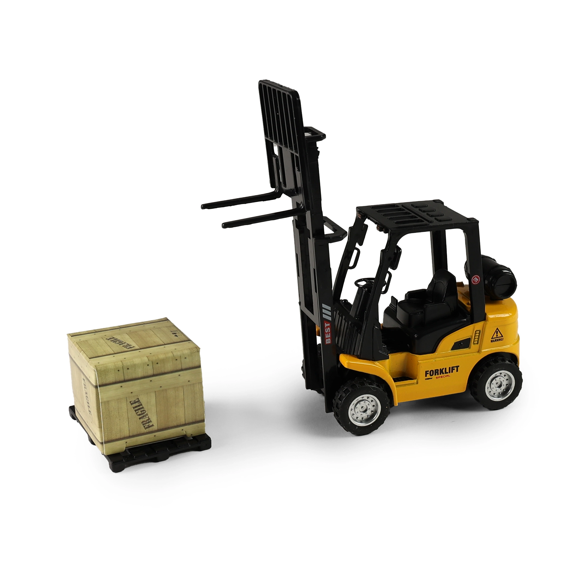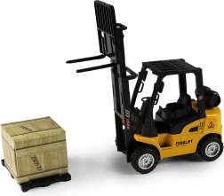 Dit gedetailleerde heftruckmodel is ideaal voor een kindercollectie van werk- en bouwmachines. Dankzij de pull-back aandrijving hoef je het speelgoed alleen naar achteren te trekken en de heftruck rijdt vanzelf naar voren. De beweegbare vork maakt realistisch laden en lossen mogelijk.