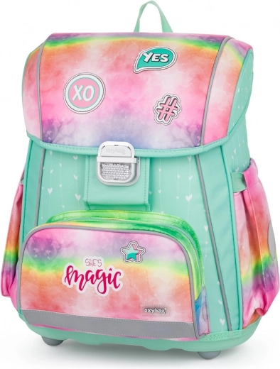 Lichte en anatomisch gevormde schooltas voor groep 3–4 met verstevigde rug, stevige constructie en een veilige metalen sluiting met reflecterende reflector. Biedt één ruime hoofdvak, een voorvak voor lunch, brede gewatteerde schouderbanden en reflecterende elementen voor betere zichtbaarheid. Inhoud 27 l, draagvermogen 8 kg, gewicht 1,1 kg.