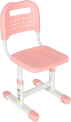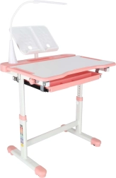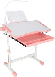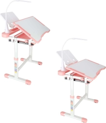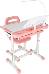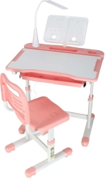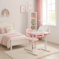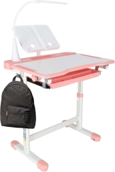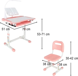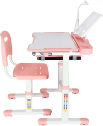Praktische kinderset in lichtroze design met een meegroeiconstructie voor zowel bureau als stoel, een kantelbaar werkblad tot 55°, een ruime uittrekbare lade met vakken en een LED-lampje met USB-voeding met 3 lichtmodi en 3 helderheidsniveaus. Inclusief boekenhouder, haak voor rugzak en bekerhouder voor orde en comfort tijdens leren en knutselen.