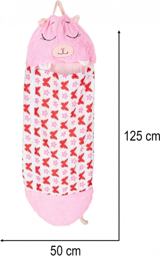 Een schattige en praktische 2-in-1 kinderslaapzak die na het opvouwen in een pluchen knuffeldier verandert. Biedt heerlijk zacht pluche materiaal, een geïntegreerd kussentje en gemakkelijk draagcomfort dankzij de compacte afmetingen en lus. Ideaal voor reizen, logeerpartijtjes en de kleuterschool. Machinewasbaar en dankzij vacuümcompressie zeer ruimtebesparend.