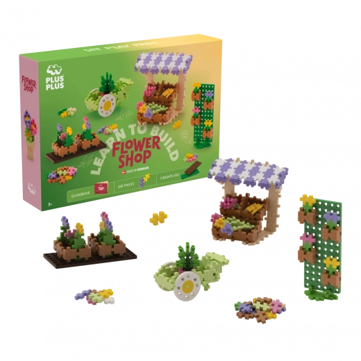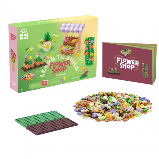 Plus-Plus Leer bouwen Bloemenwinkel: 600 stukjes, 2 bouwplaten, instructieboekje. Deense kwaliteit, gerecycled plastic, vrij van ftalaten. Geschikt vanaf 5 jaar.