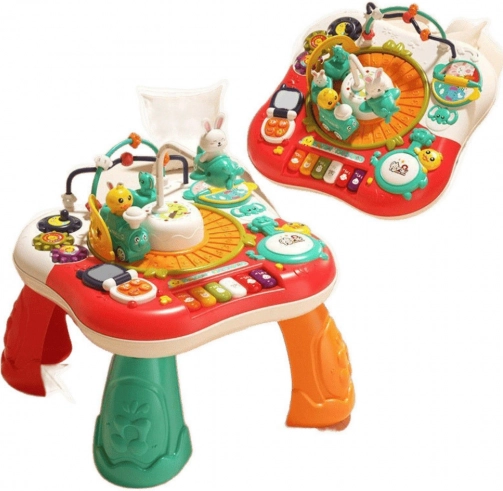 De tafel kan gebruikt worden als klassieke staande tafel of als plat educatief paneel – dankzij de afneembare poten past hij zich gemakkelijk aan de leeftijd van het kind en de beschikbare ruimte aan. Het middelpunt van het spel is het bewegende konijntje, dat aandacht en oog-handcoördinatie stimuleert, terwijl de piano en de trommel het spel verrijken met vrolijke melodieën en geluiden.