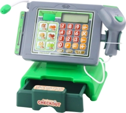- imitatie van kassawerk, microfoon, scanner, cijfer toetsenbord, licht- en geluidseffecten