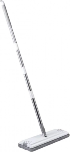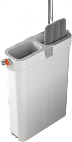 De moderne tweekamer-emmer scheidt schoon en vuil water voor een hygiënischere en snellere schoonmaak. De vlakmop met verstelbare telescoopsteel past zich eenvoudig aan de lengte van de gebruiker aan en bereikt smalle plaatsen, onder bedden of kasten.
