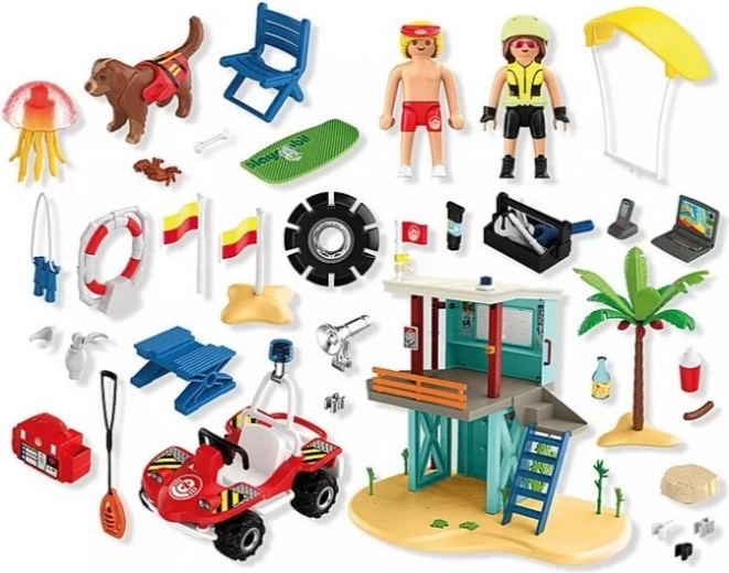 - reddingstoren (2 verdiepingen), strandbuggy, redder, reddingshond, kitesurfer, kwal, krab, reddingsboard, gereedschap, accessoires