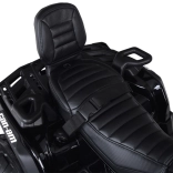 De zachte eco‑leren zitting met rugsteun en veiligheidsgordels biedt comfort en ondersteuning voor bestuurder en passagier.