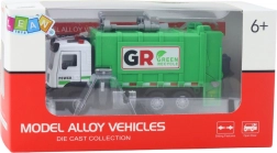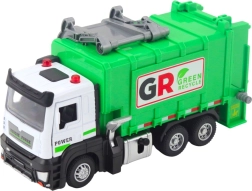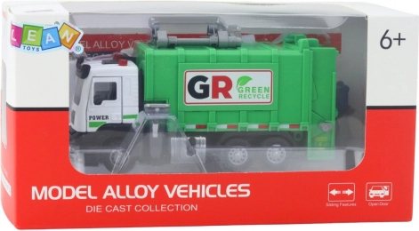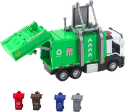 Het model heeft een openende achterklep en een hefmechanisme voor containers, zodat afval realistisch kan worden geladen en gelost. Vier gekleurde bakken motiveren kinderen tot afvalscheiding en leren over milieubescherming. De stevige constructie van kunststof aangevuld met metalen delen kan intensief spelen aan.