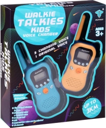 Leuke set van twee kinderwalkietalkies voor spelletjes buiten en binnen met een bereik tot 3 km in open terrein. Eenvoudige bediening, 16 frequenties, volumeregeling en stemvervormer (jongen, meisje, robot + origineel) zorgen voor volop actie. Inclusief oproepstart (4 tonen), riemclip en opening voor een polskoord – ideaal voor tuin, strand, bos en geheime missies.