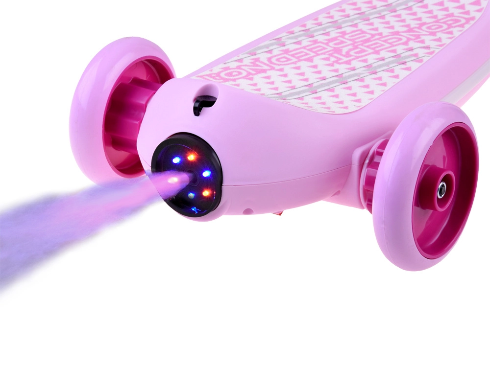Deze elektrische kinderstep combineert een geweldige visuele show met eenvoudige bediening en een stabiele driewielerconstructie. De DISCO-lichteffecten verlichten het deck en het voorste gedeelte, muzikale begeleiding zorgt voor een geweldige sfeer en het achterste mist-effect met waterdamp zal elk kind verrassen.
