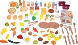 - Rijke accessoires – pan met deksel, koekenpan, kannetje, keukengerei, servies, fruit, groenten, vlees en desserts.
