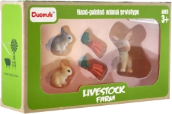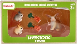 Deze set bevat 3 plastic konijntjes in verschillende kleuren en houdingen, aangevuld met kleine accessoires voor verzorging en spel. Kinderen kunnen hun eigen verhalen bedenken, hun verbeelding ontwikkelen en de fijne motoriek oefenen.