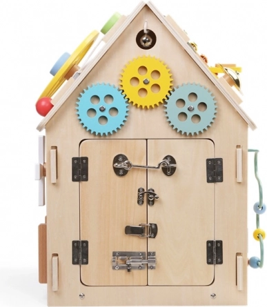 Houten actief huisje 2Kids Toys voor kinderen vanaf 3 jaar. Stuur, doolhof, sloten, telraam en meer voor ontwikkeling van motoriek en logica. Veilig ontwerp.