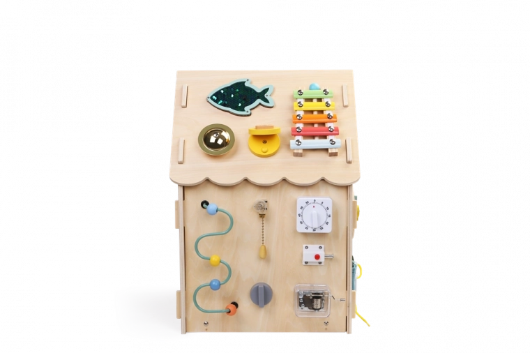 Ontdek het houten actieve huisje vol spel en leren voor kinderen vanaf 3 jaar. Elke zijde biedt interactieve elementen die de fijne motoriek, het logisch denken en de zintuiglijke waarneming stimuleren. Kinderen genieten van een stuur en versnellingspook, tandwielen, een doolhof met een knikker, een telraam en oefenen met sloten, rits, knoop en veters. Veilig ontwerp van hoogwaardig natuurlijk hout en niet-giftige verf.
