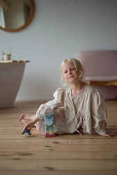 Deze pastel balanstoren bevat 11 zorgvuldig bewerkte houten onderdelen die correct in elkaar moeten passen. Dankzij de afgeronde vormen en doordachte constructie kun je de toren niet alleen rechtop stapelen, maar ook veilig naar beide kanten laten overhellen om zo geduld en fijne motoriek te trainen.
