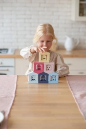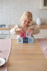 Ontdek de creatieve houten bouwset CUBIKA in zachte pastelkleuren met 30 onderdelen, inclusief blokjes met emoticons. Bouw zes huisjes, elk met zijn eigen bewoner in de bijpassende kleur – kinderen oefenen spelenderwijs kleurherkenning, fijne motoriek en logisch denken. Het speelgoed is gemaakt van hoogwaardig esdoorn- en beukenhout, heeft veilige verf op waterbasis en voldoet aan norm EN 71. 30 delen, pastelkleuren, kleuren leren, veilige materialen, vanaf 24 maanden, gemaakt in Europa.