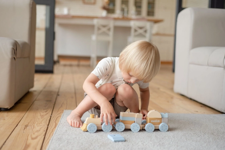 De pastel regenboogtrein van CUBIKA is een hoogwaardig houten stapelspel dat spel en leren combineert. Kinderen stapelen gekleurde blokken op de pinnen van de locomotief en de twee wagons en trainen zo handcoördinatie, kleuren en vormen. Na het samenstellen is de trein ongeveer 38 cm lang en klaar voor een fantasierijke reis.