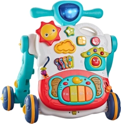 De interactieve loopwagen en ride-on 3-in-1 ondersteunt de eerste stapjes en de ontwikkeling van motoriek en zintuigen. Combineert een loopwagen, educatief paneel en speeltafel. Dankzij licht- en geluidseffecten, een piano met 5 toetsen en stabiele, brede wielen met verstelbare weerstand biedt hij veilig en leuk spelen dat meegroeit met het kind.
