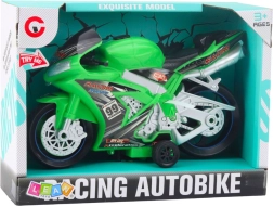 Deze groene racemotor maakt alle kleine fans van snelheid en motorsport blij. Hij is gemaakt van duurzaam kunststof, heeft een stabiele standaard en brede wielen voor stabiel rijden op verschillende ondergronden. Na het indrukken van de knop starten lichteffecten en realistische motorgeluiden die de spelbeleving versterken.
